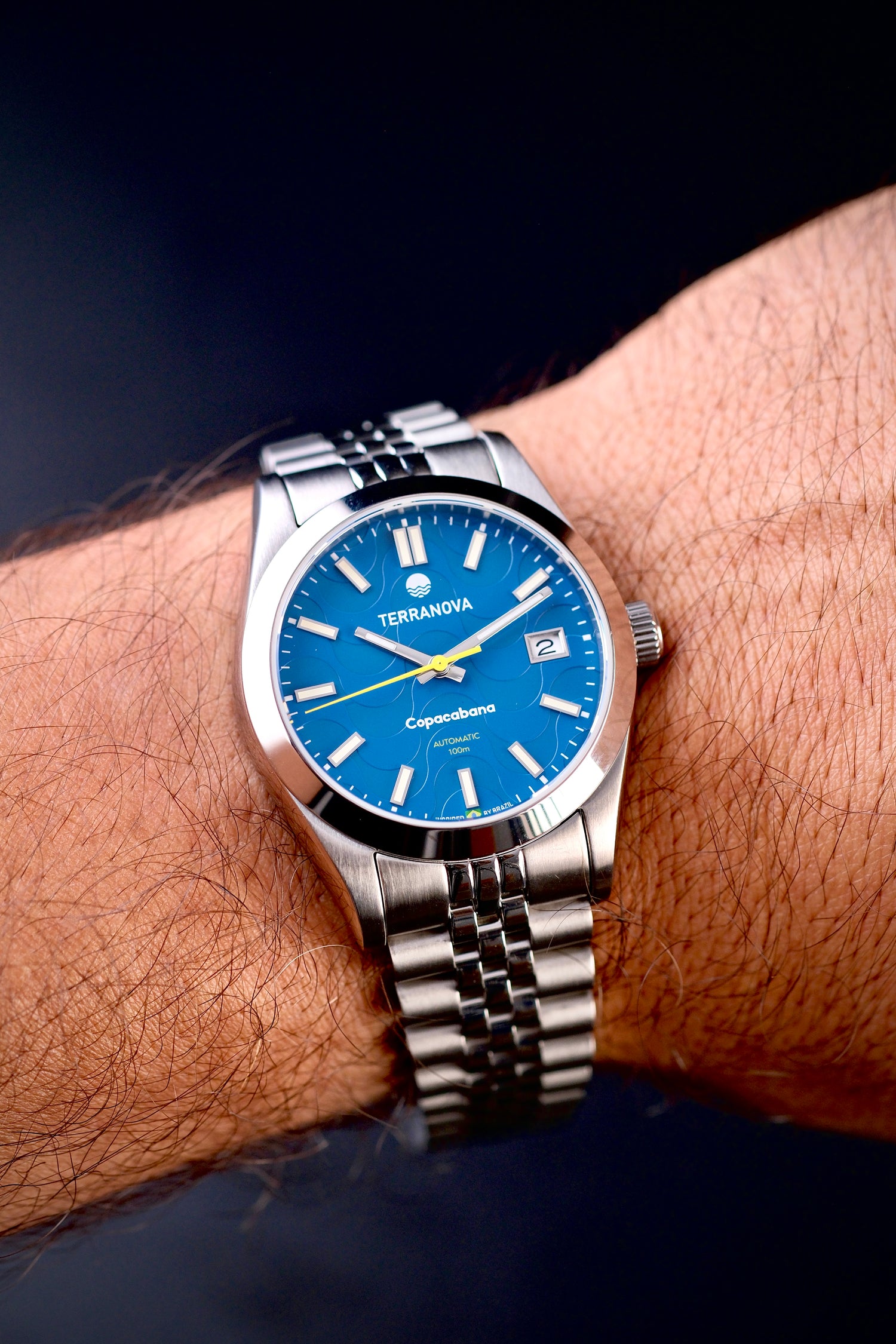 O Terranova Copacabana é feito de aço inoxidável 316L, com laterais polidas e a parte superior escovada. No topo da caixa, há um cristal de safira plano com revestimento antirreflexo. Os marcadores de hora utilizam lume azul BGW9 Swiss Super-Luminova. A pulseira Jubilee incluída possui elos maciços, proporcionando qualidade e conforto, sem perder a esportividade.