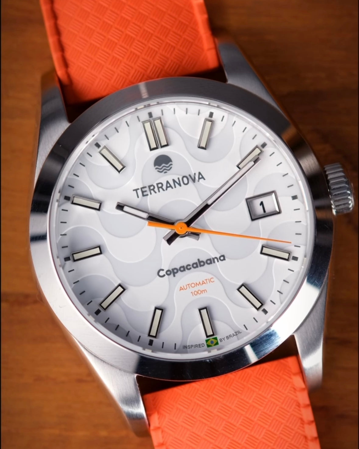 Além de ser um relógio elegante, outro aspecto do Terranova Copacabana também se destaca: sua robustez – resistência à água de 100 metros, cristal de safira resistente a riscos, coroa rosqueada, pulseira com elos maciços, tudo isso impulsionado pelo preciso e confiável movimento NH35.