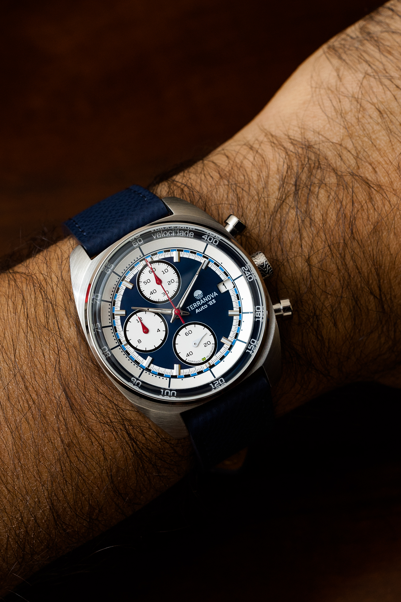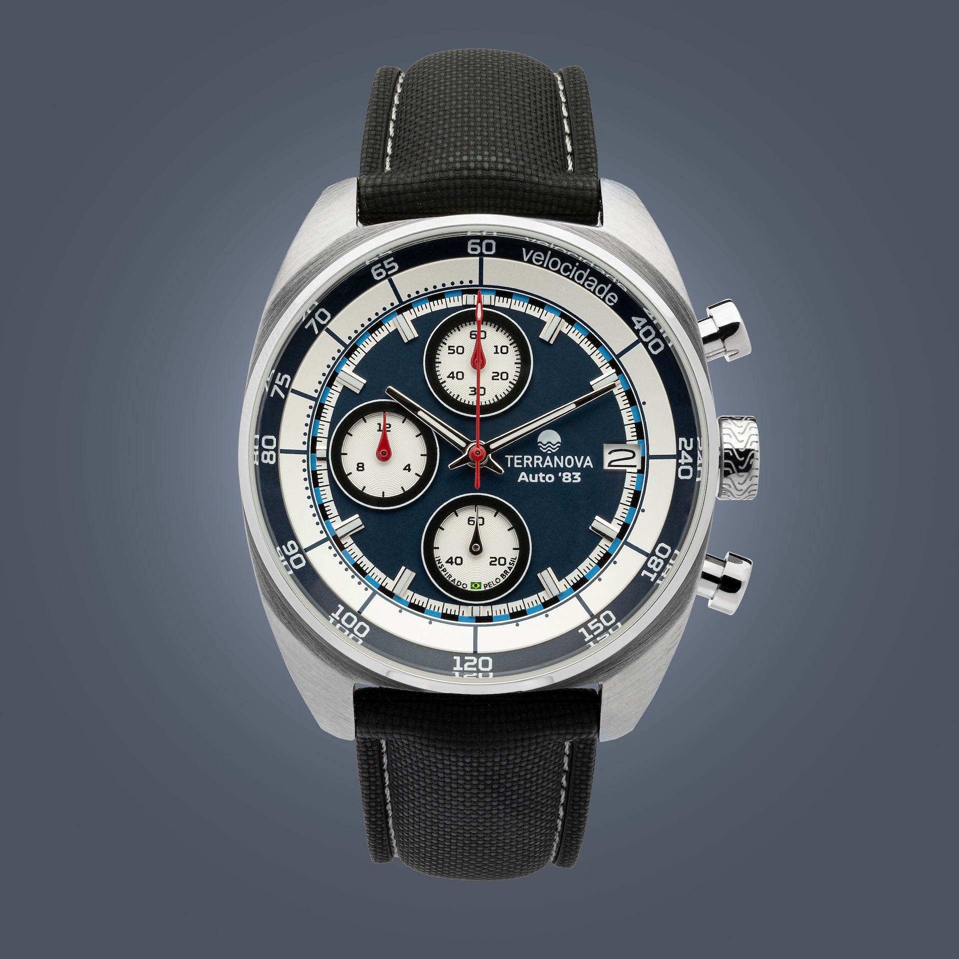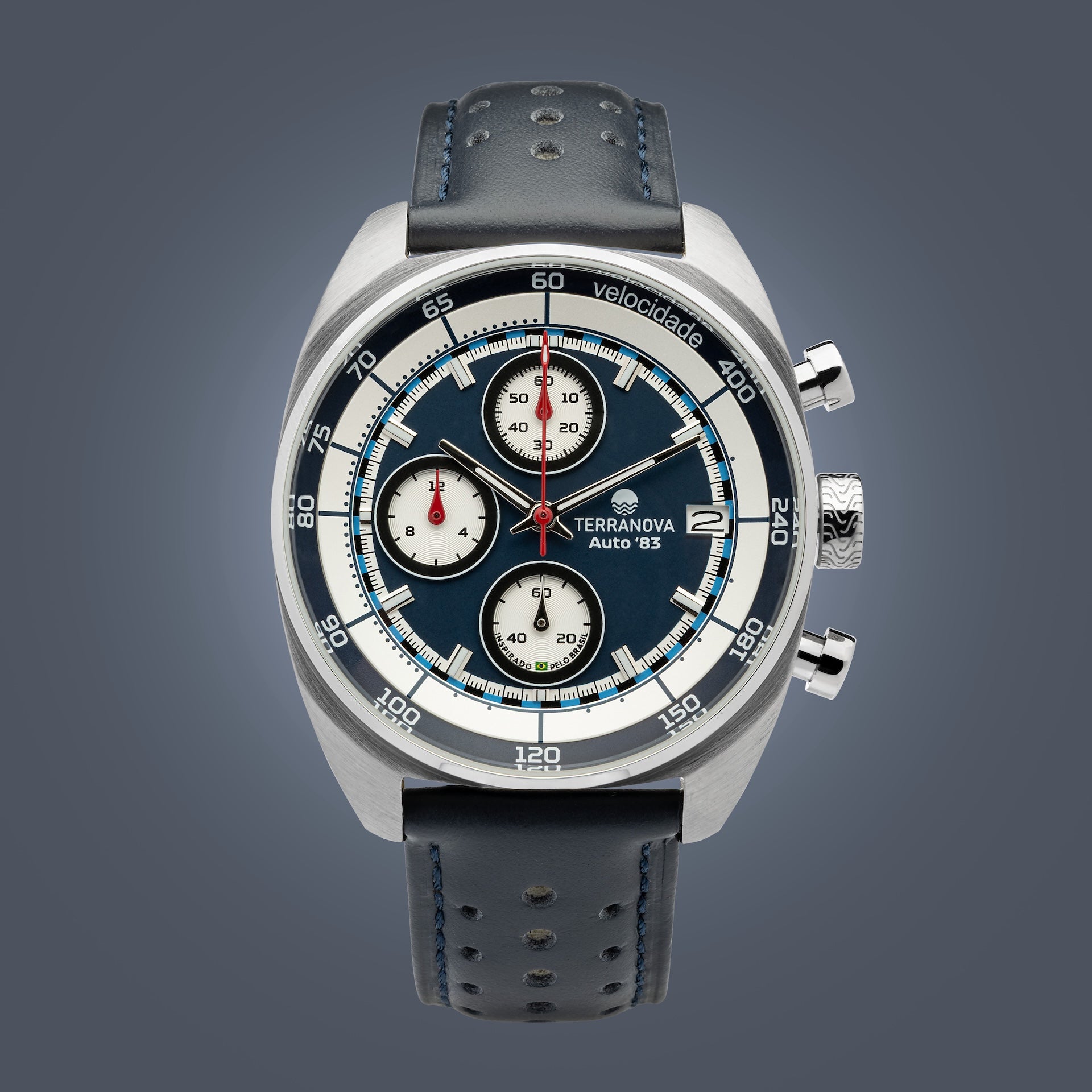 O Terranova Automobilista Auto '83 Ref. TNA 02 combina estética esportiva clássica com refinamento contemporâneo. Seu mostrador em azul profundo contrasta com os totalizadores brancos em tricompax, trazendo a atmosfera dos cronógrafos de competição do início dos anos 80 — um período marcado por avanços técnicos, estratégias arrojadas e um novo capítulo de conquistas brasileiras nas pistas.