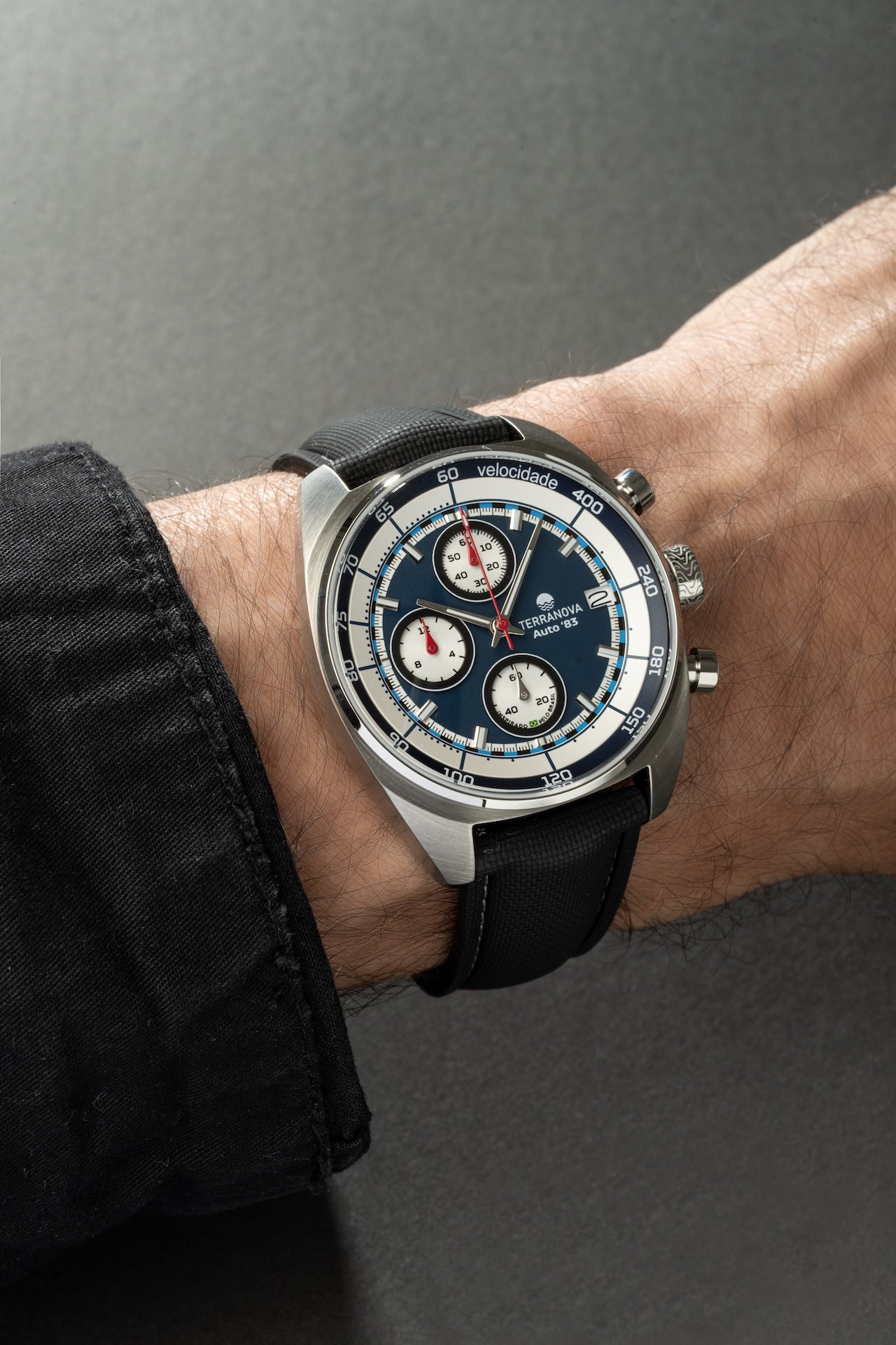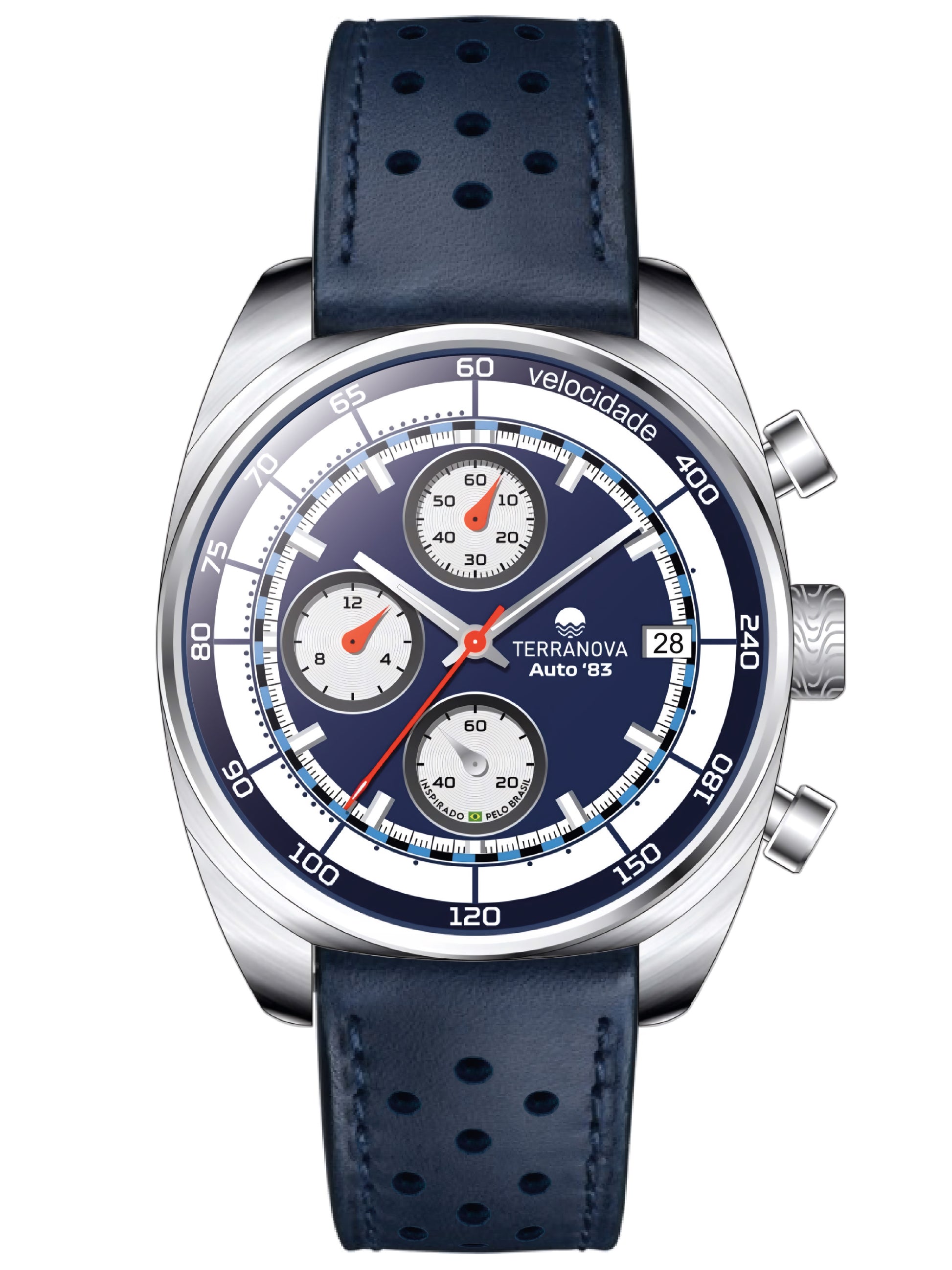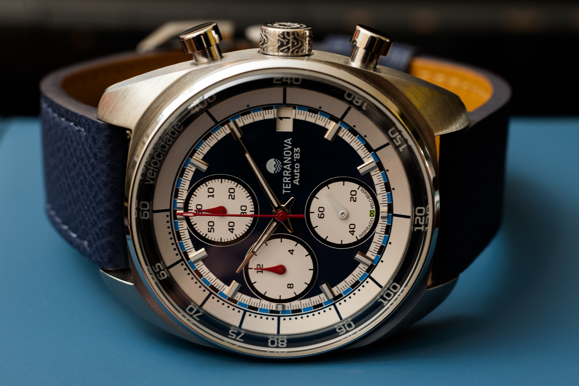 O Terranova Automobilista Auto '83 Ref. TNA 02 combina estética esportiva clássica com refinamento contemporâneo. Seu mostrador em azul profundo contrasta com os totalizadores brancos em tricompax, trazendo a atmosfera dos cronógrafos de competição do início dos anos 80 — um período marcado por avanços técnicos, estratégias arrojadas e um novo capítulo de conquistas brasileiras nas pistas.