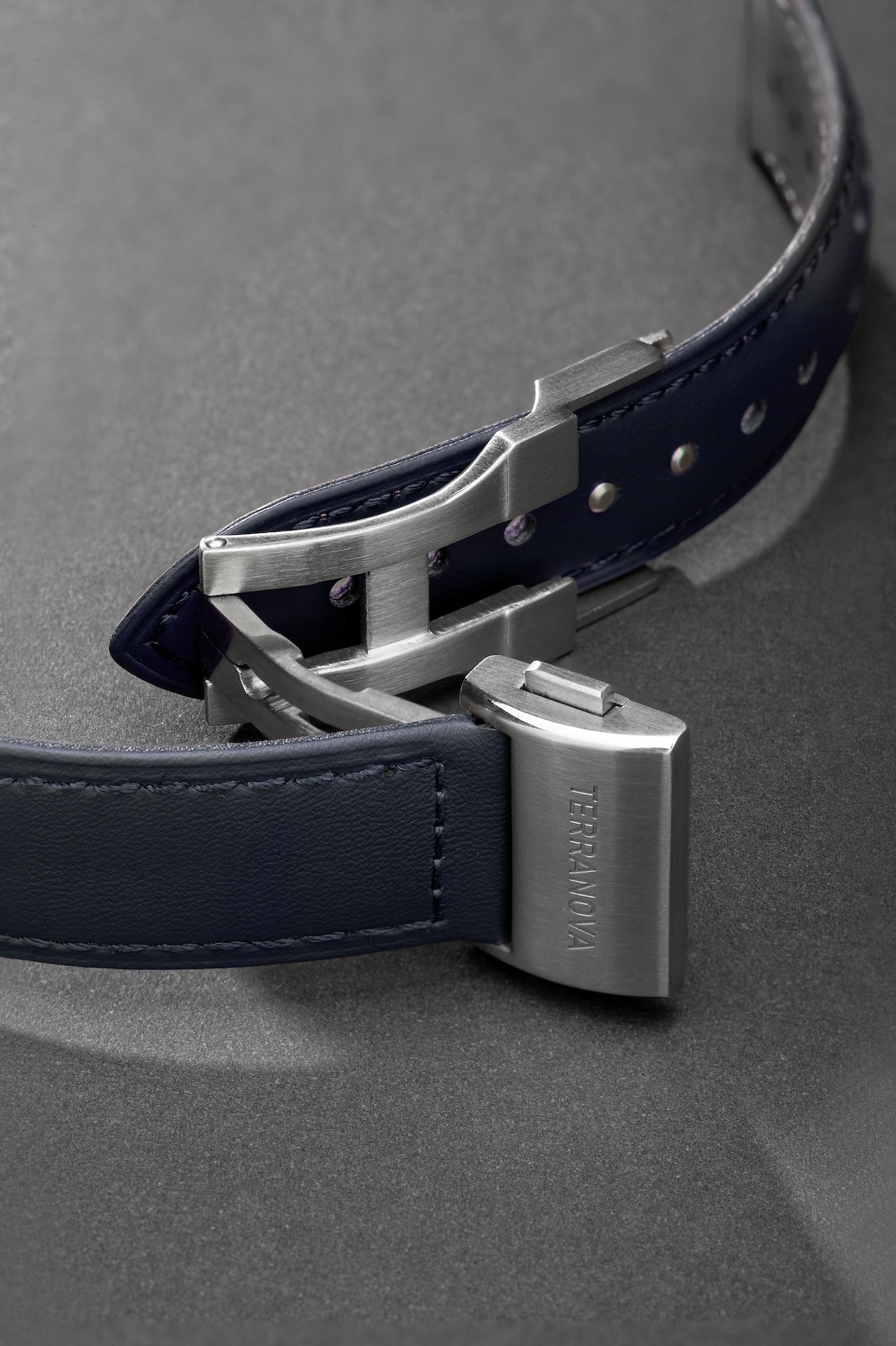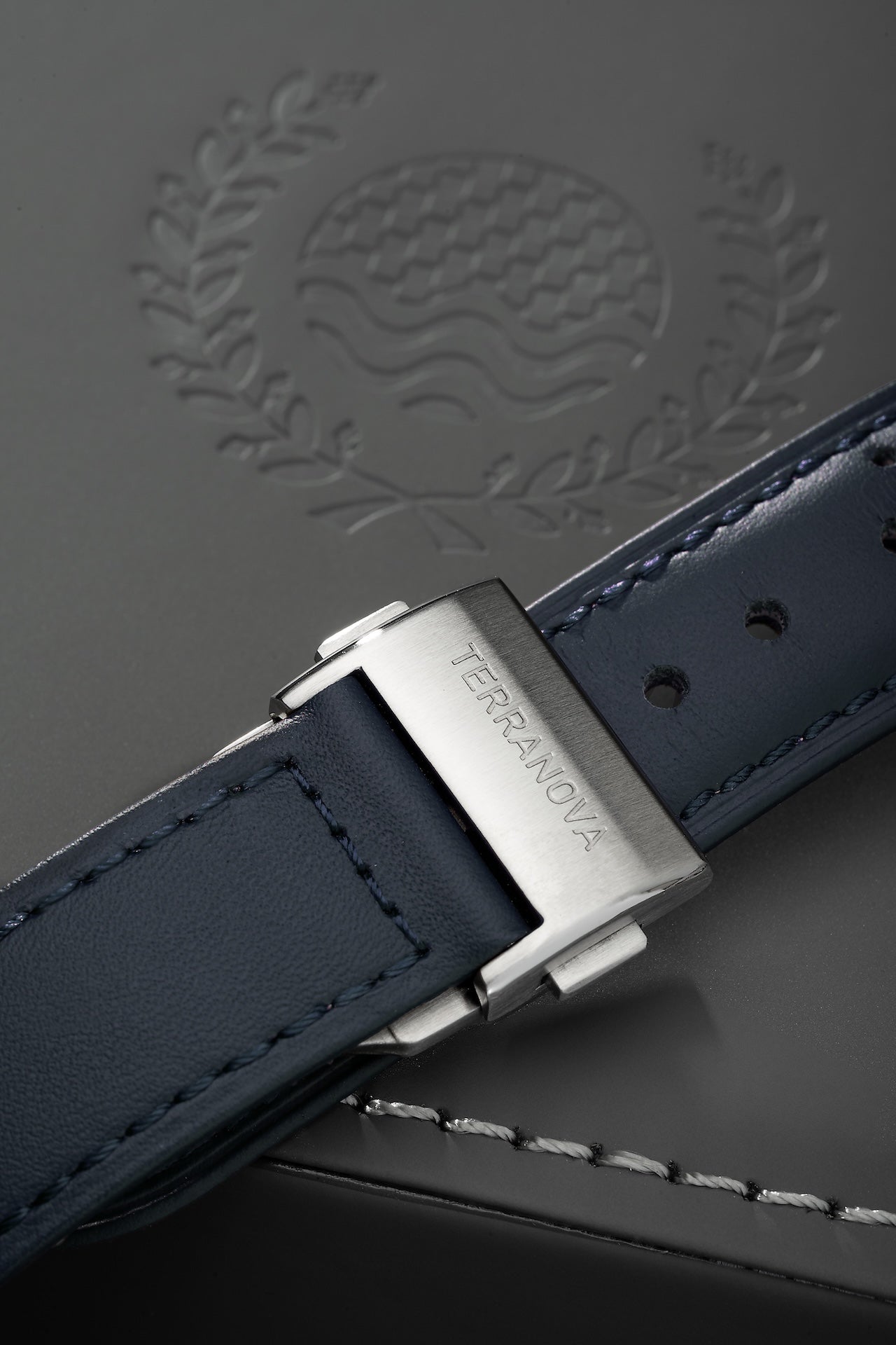 - Pulseira em couro azul estilo "Racing" com fecho deployant em aço inoxidável 316L e engate rápido