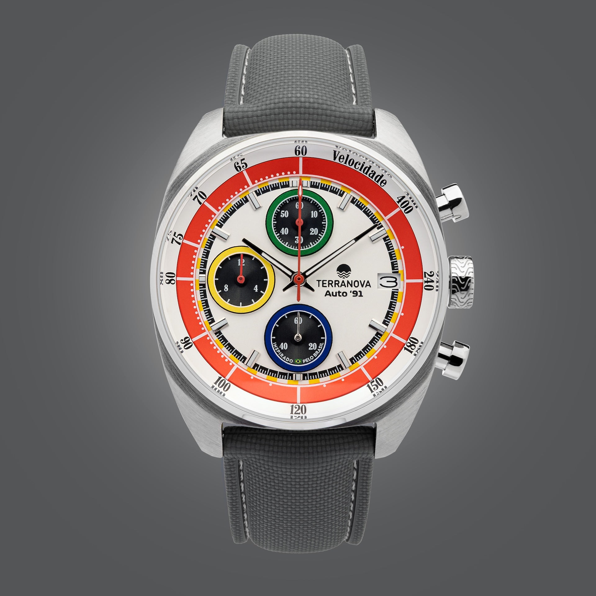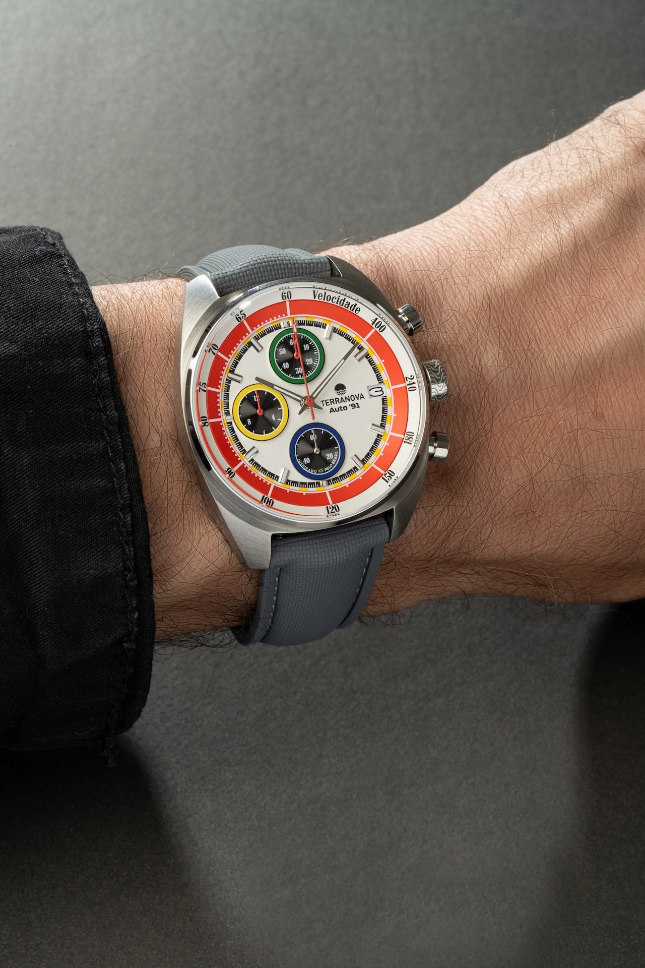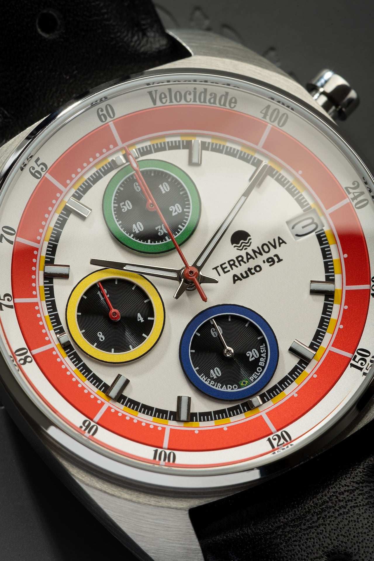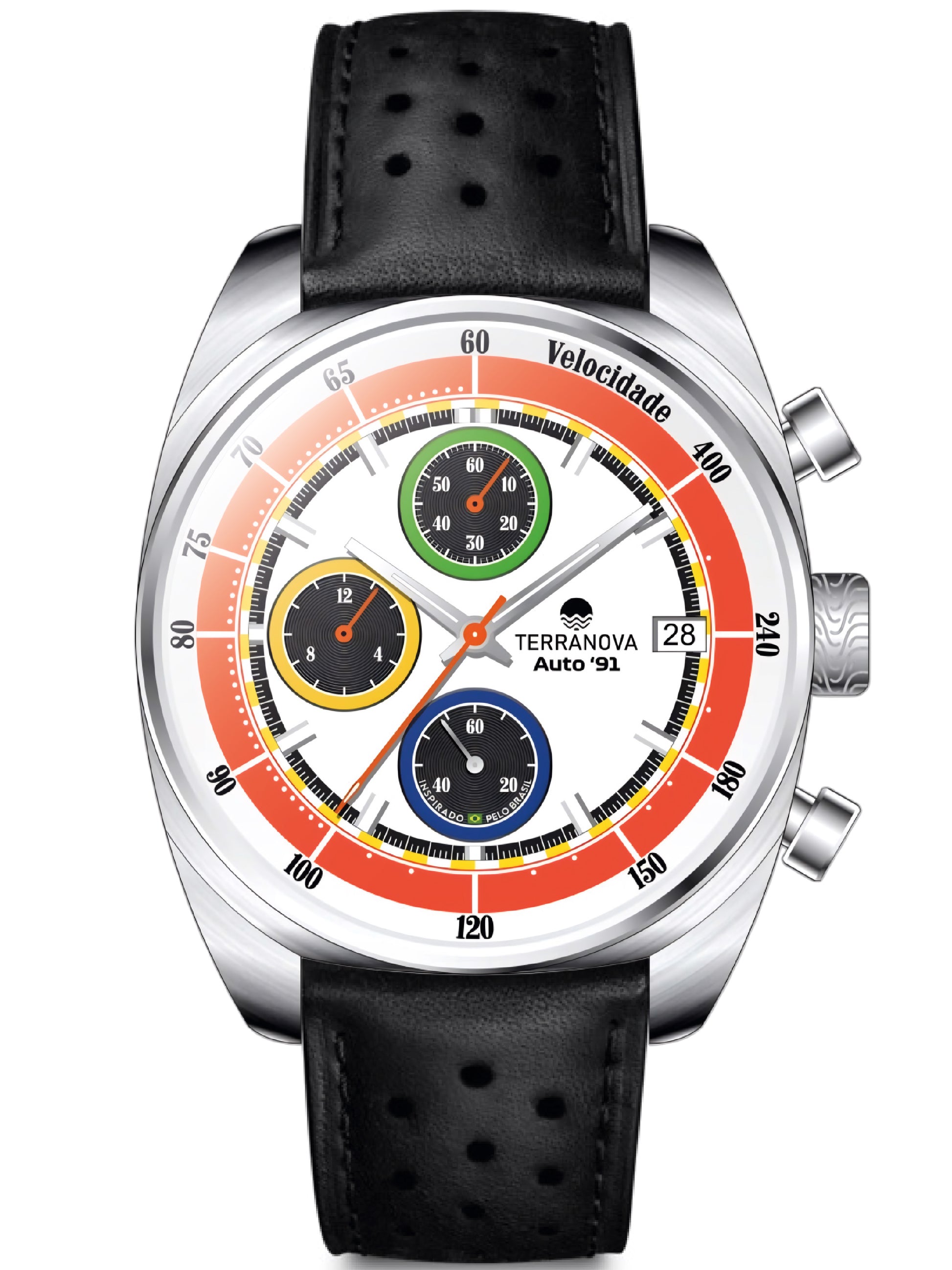 Seu mostrador claro contrasta com os totalizadores coloridos em tricompax, trazendo uma estética enérgica e imediata que remete às pistas e ao clima competitivo da época. O anel interno em vermelho e laranja adiciona profundidade e dinamismo, enquanto a caixa escovada e a pulseira perfurada reforçam o DNA esportivo clássico dos cronógrafos de corrida.