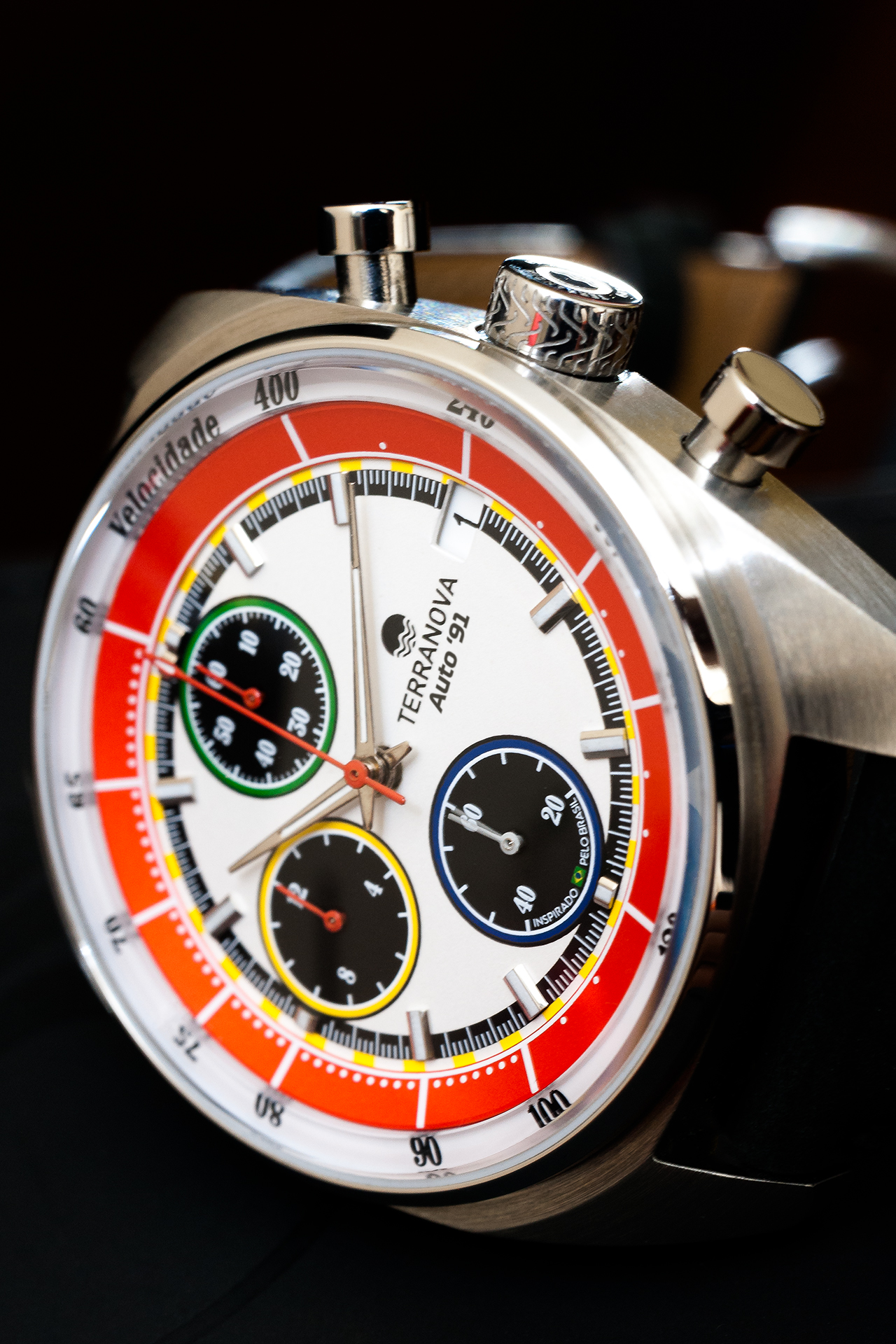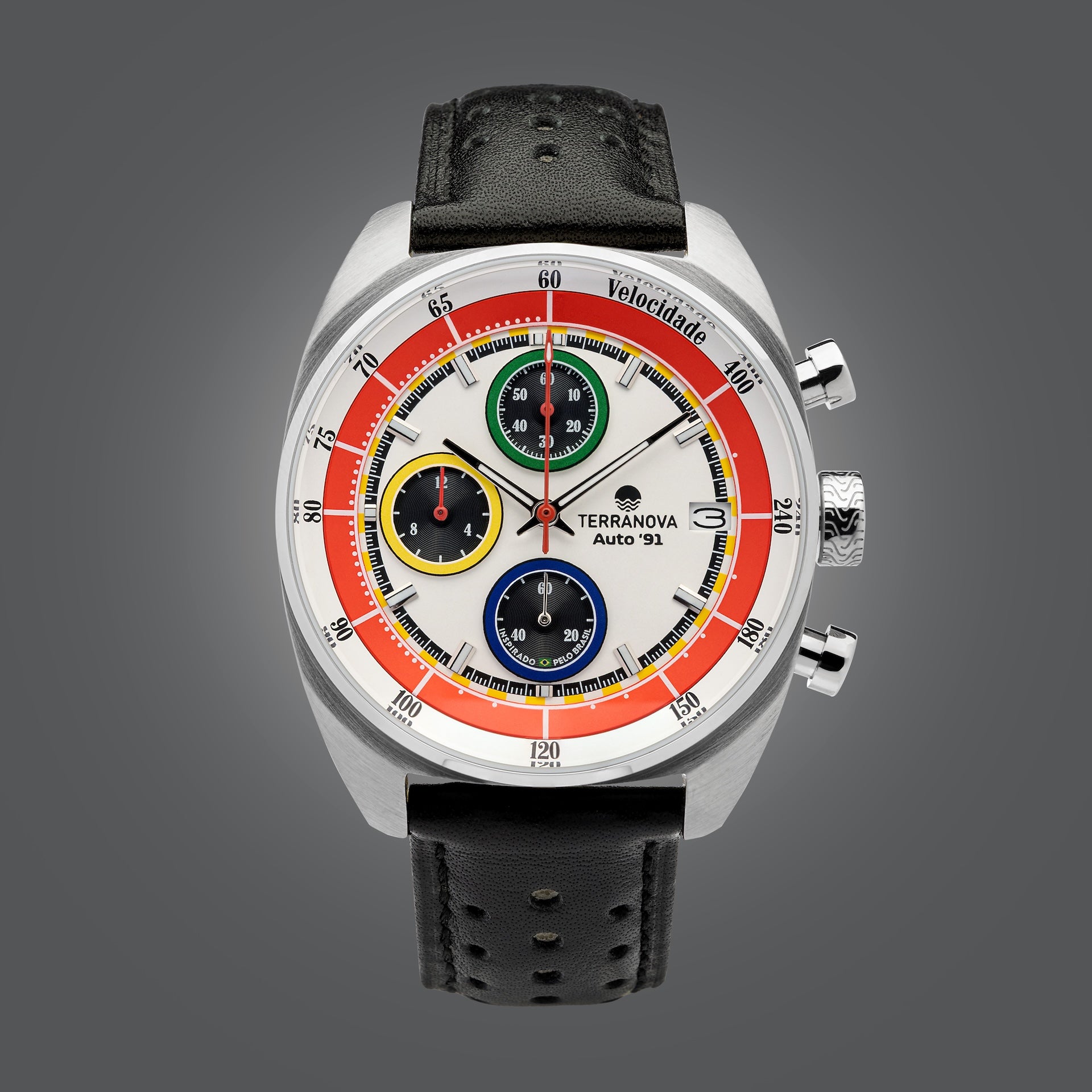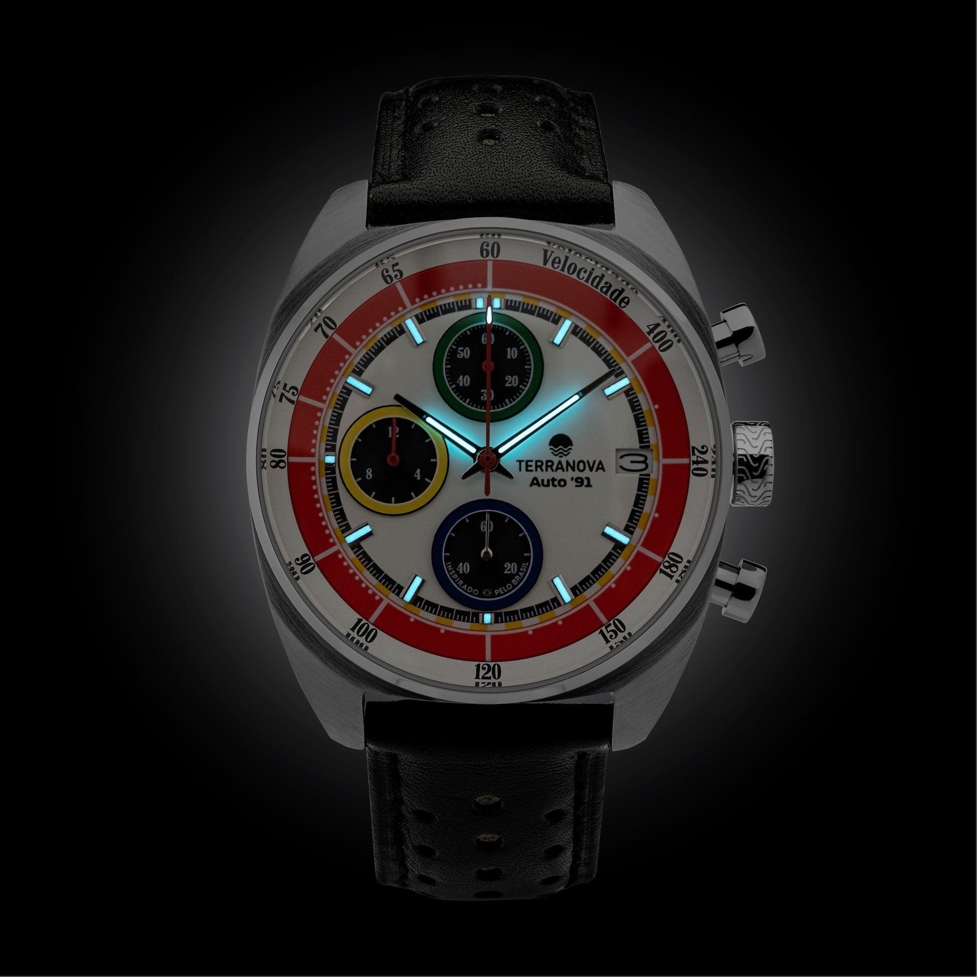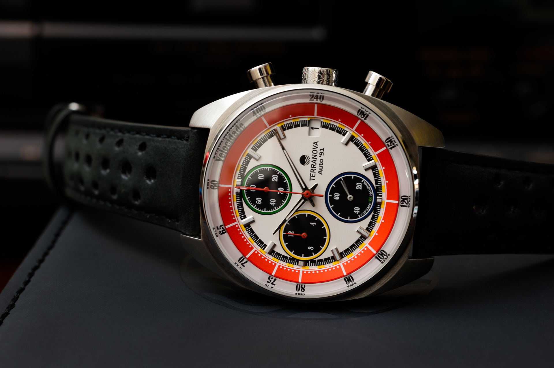 Seu mostrador claro contrasta com os totalizadores coloridos em tricompax, trazendo uma estética enérgica e imediata que remete às pistas e ao clima competitivo da época. O anel interno em vermelho e laranja adiciona profundidade e dinamismo, enquanto a caixa escovada e a pulseira perfurada reforçam o DNA esportivo clássico dos cronógrafos de corrida.