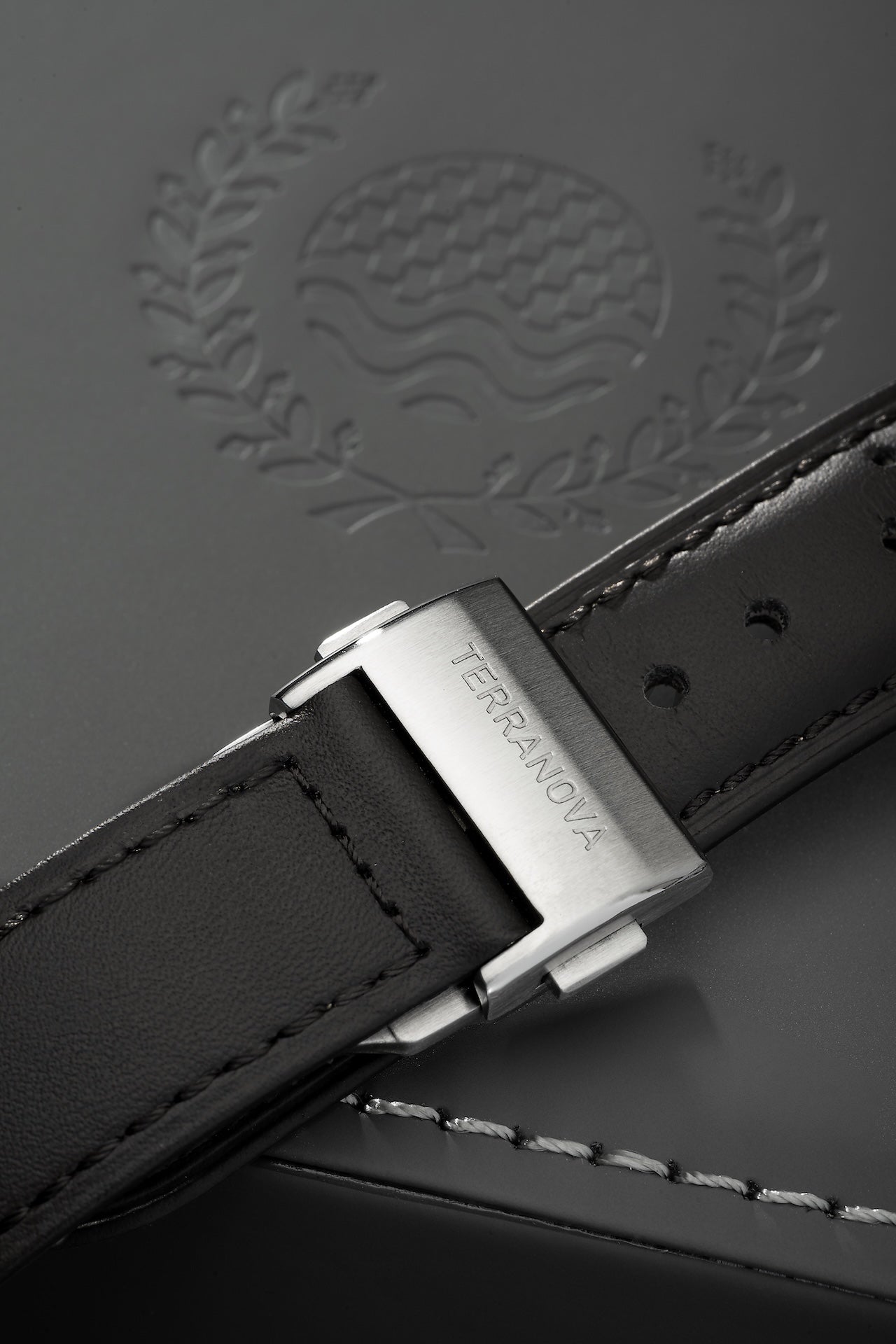 - Pulseira em couro preto estilo "Racing" com fecho deployant em aço inoxidável 316L e engate rápido